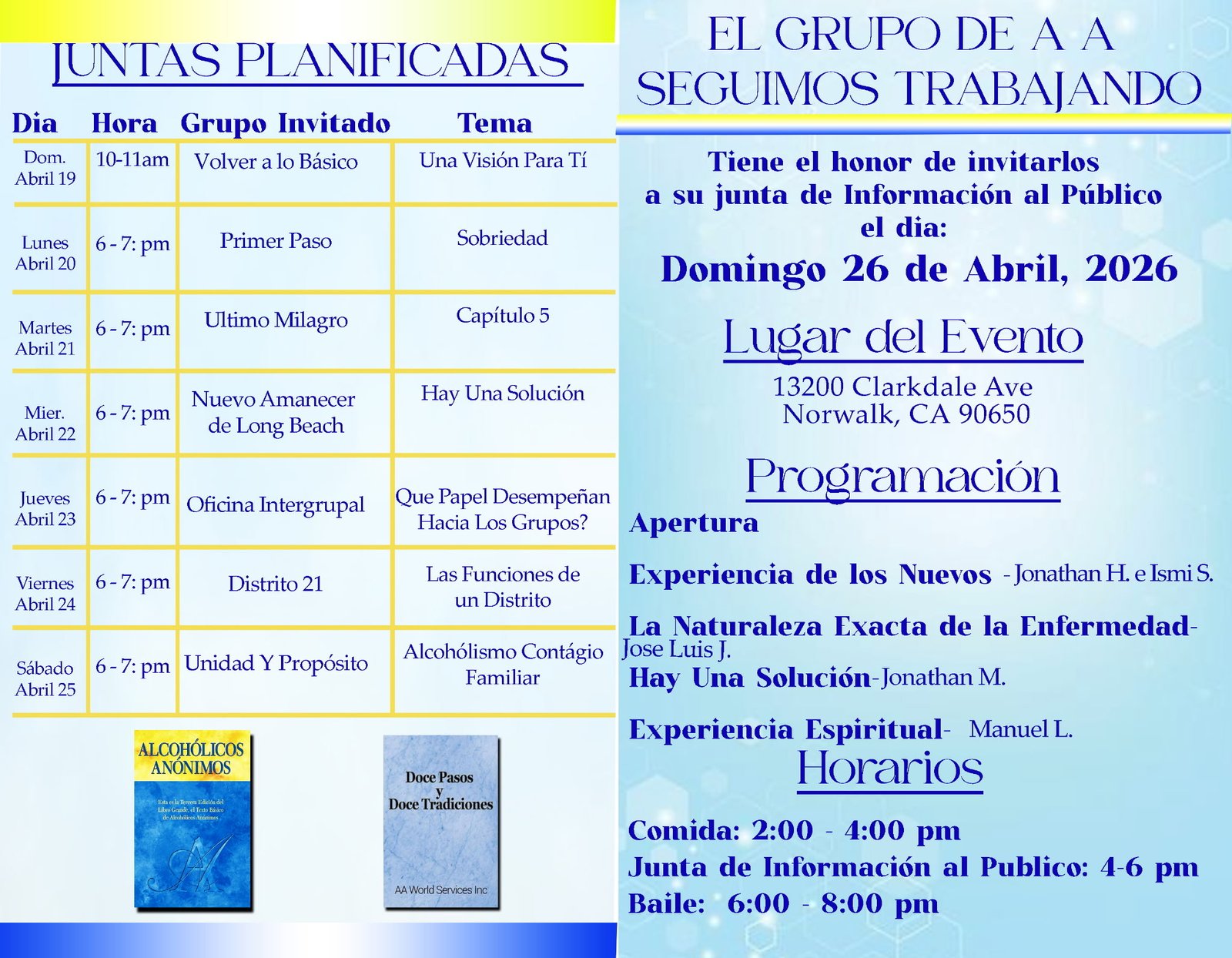 « Todos los Eventos 3er Aniversario Grupo Seguimos Trabajando abril 26 @ 2:00 pm - 8:00 pm « Gran Maratonica Oficina Intergrupal 53 Convencion Hispana de USA y Canada » Agregar al calendario Google Calendar iCalendar Outlook 365 Outlook Live Detalles Fecha: abril 26 Hora: 2:00 pm - 8:00 pm Lugar 13200 Clarkdale ave 13200 Clarkdale ave. Norwalk, 90650 United States + Google Map
