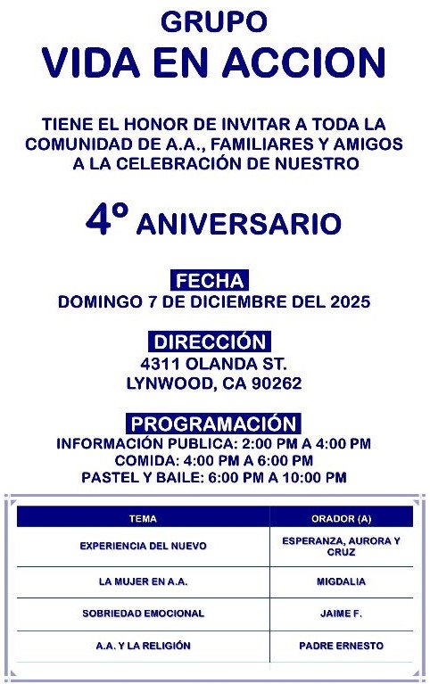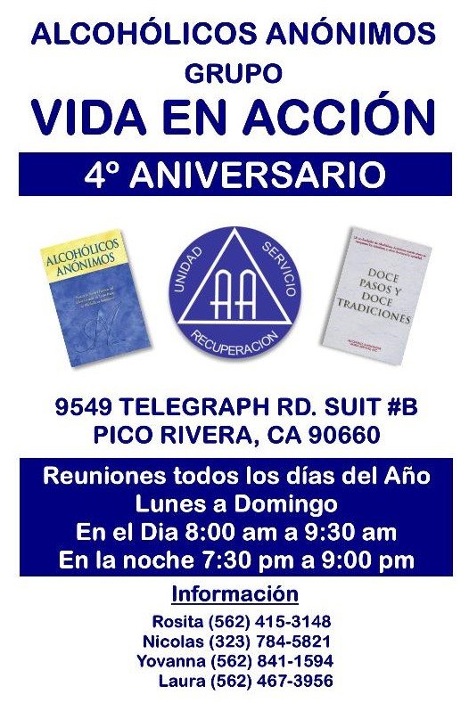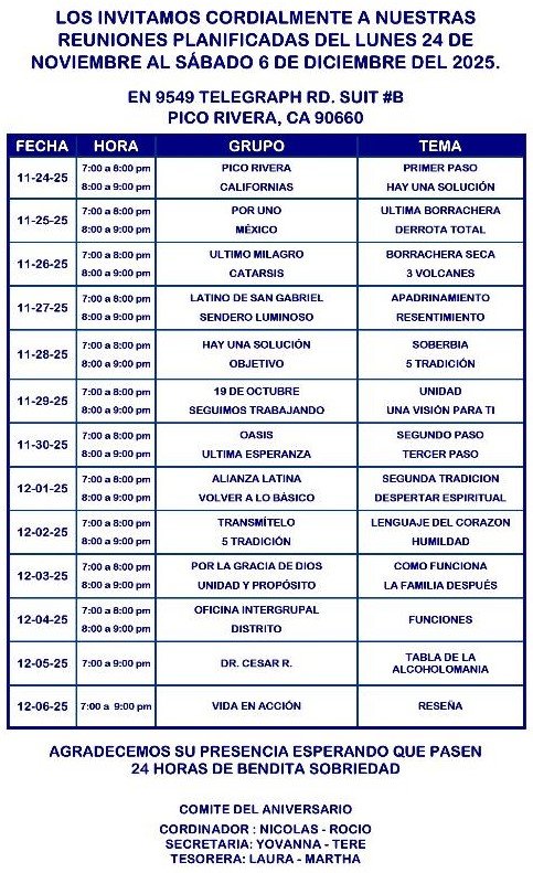 « Todos los Eventos Aniversario #4 Grupo Vida en Acción diciembre 7 @ 2:00 pm - 10:00 pm « 33 Aniversario de la Intergrupal del Sur de la Bahía Agregar al calendario Google Calendar iCalendar Outlook 365 Outlook Live Detalles Fecha: diciembre 7 Hora: 2:00 pm - 10:00 pm Lugar 4311 Olanda st. 4311 Olanda St. Lynwood, 90262 United States + Google Map