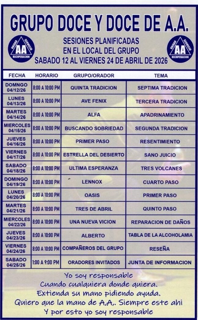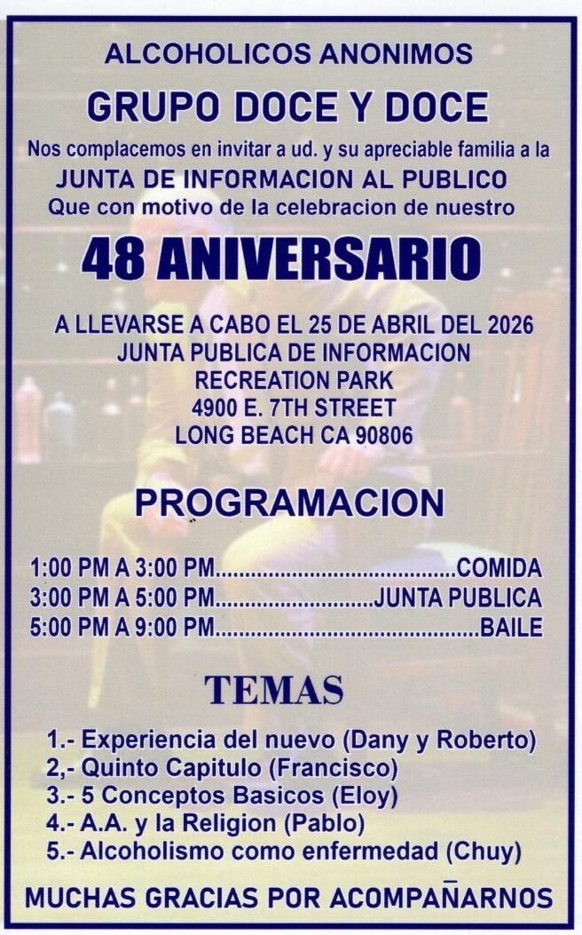 « Todos los Eventos Aniversario grupo Doce y Doce abril 25 @ 1:00 pm - 9:00 pm « La Viña (Taller de Escritura) 3er Aniversario Grupo Seguimos Trabajando » Agregar al calendario Google Calendar iCalendar Outlook 365 Outlook Live Detalles Fecha: abril 25 Hora: 1:00 pm - 9:00 pm Lugar Recreation Park 4900 E. 7th Street Long Beach, 90806 United States + Google Map