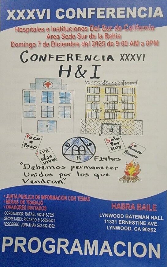 « Todos los Eventos XXXVl Conferencia de H&I diciembre 7 @ 9:00 am - 8:00 pm « 33 Aniversario de la Intergrupal del Sur de la Bahía Aniversario #4 Grupo Vida en Acción » Agregar al calendario Google Calendar iCalendar Outlook 365 Outlook Live Detalles Fecha: diciembre 7 Hora: 9:00 am - 8:00 pm Organizador Comite de H & I Lugar Lynwood Bateman Hall 11331 Ernestine Ave. Lynwood, 90262 United States + Google Map